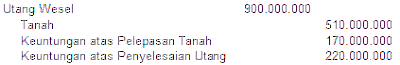 PT Belina memiliki utang kepada PT Andalas sejumlah Rp900.000.000 dalam bentuk wesel. Akhir-akhir ini, PT Belina sedang mengalami kesulitan keuangan. Untuk menyelesaikan utang bermasalah itu, PT Andalas sepakat untuk mengambil alih tanah milik PT Belina. Nilai pasar wajar tanah tersebut pada saat pengambilalihan adalah Rp680.000.000, sedangkan pembukuan PT Belina mencatat nilai pemerolehan tanah itu sebesar Rp510.000.000.